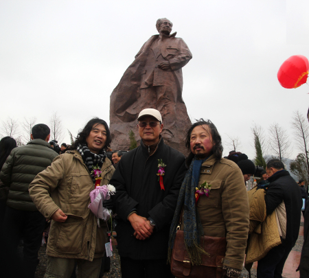 張愛萍之子張翔(中)和雕塑家、書法家劉憲(右)和耀邦雕塑作者東郭在像前留影