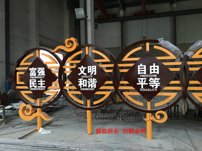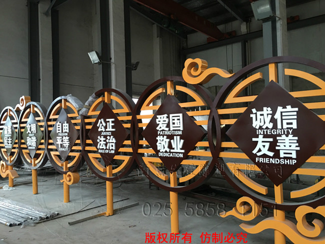 核心價值觀雕塑,位于南京市江寧區(qū)谷里街道徐家院,采用不銹鋼材質噴漆技術